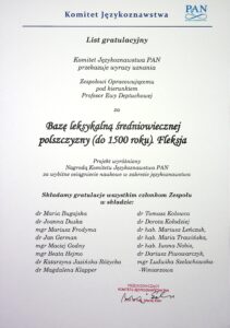 - prof. IJP PAN dr hab. Ewa Deptuchowa wraz z dr Katarzyną Jasińską-Różycką, reprezentujące zespół kilkunastu badaczy współtworzących nagrodzony projekt Baza leksykalna średniowiecznej polszczyzny. Fleksja, wygłosiły referat Z badań nad staropolską fleksją;